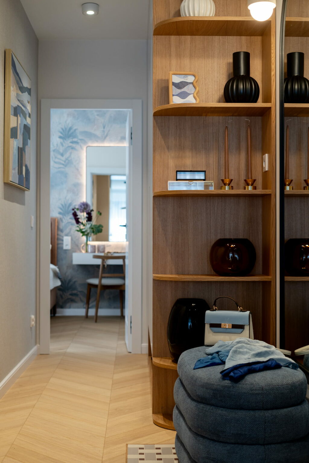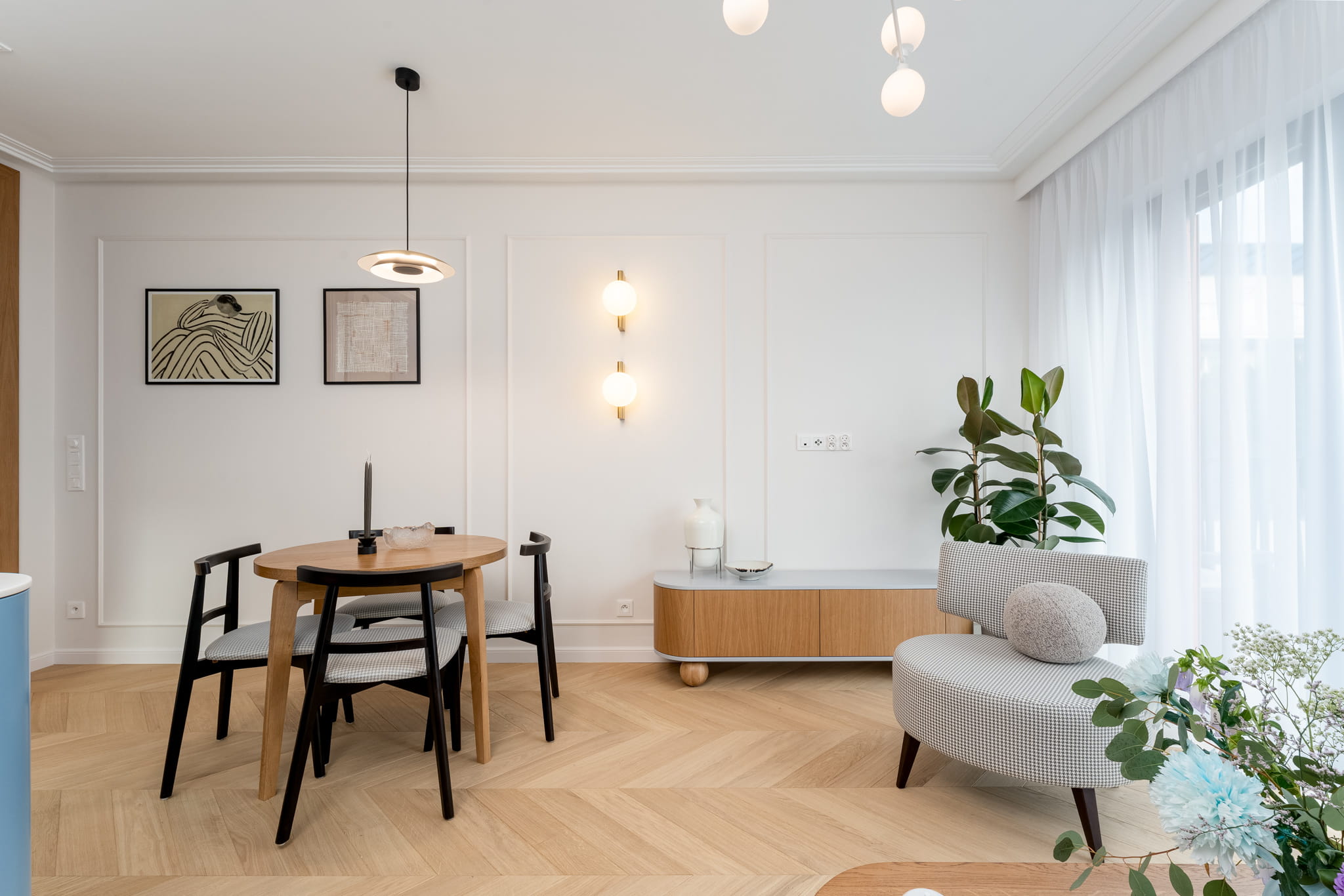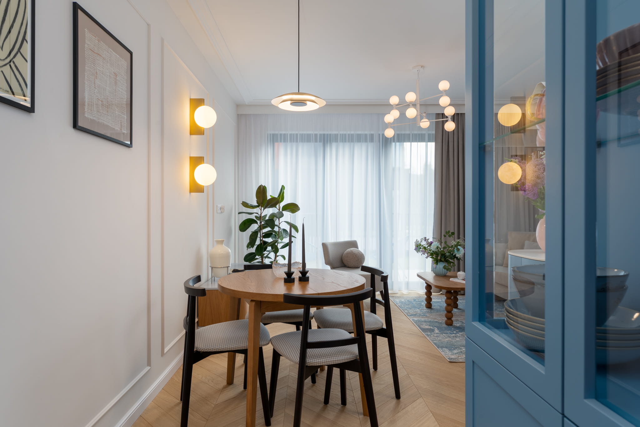 Wnętrze powstało z myślą o właścicielce, która przeprowadzała się z domu do mieszkania i oczekiwała przestrzeni eleganckiej, dopasowanej do jej stylu życia i potrzeb.