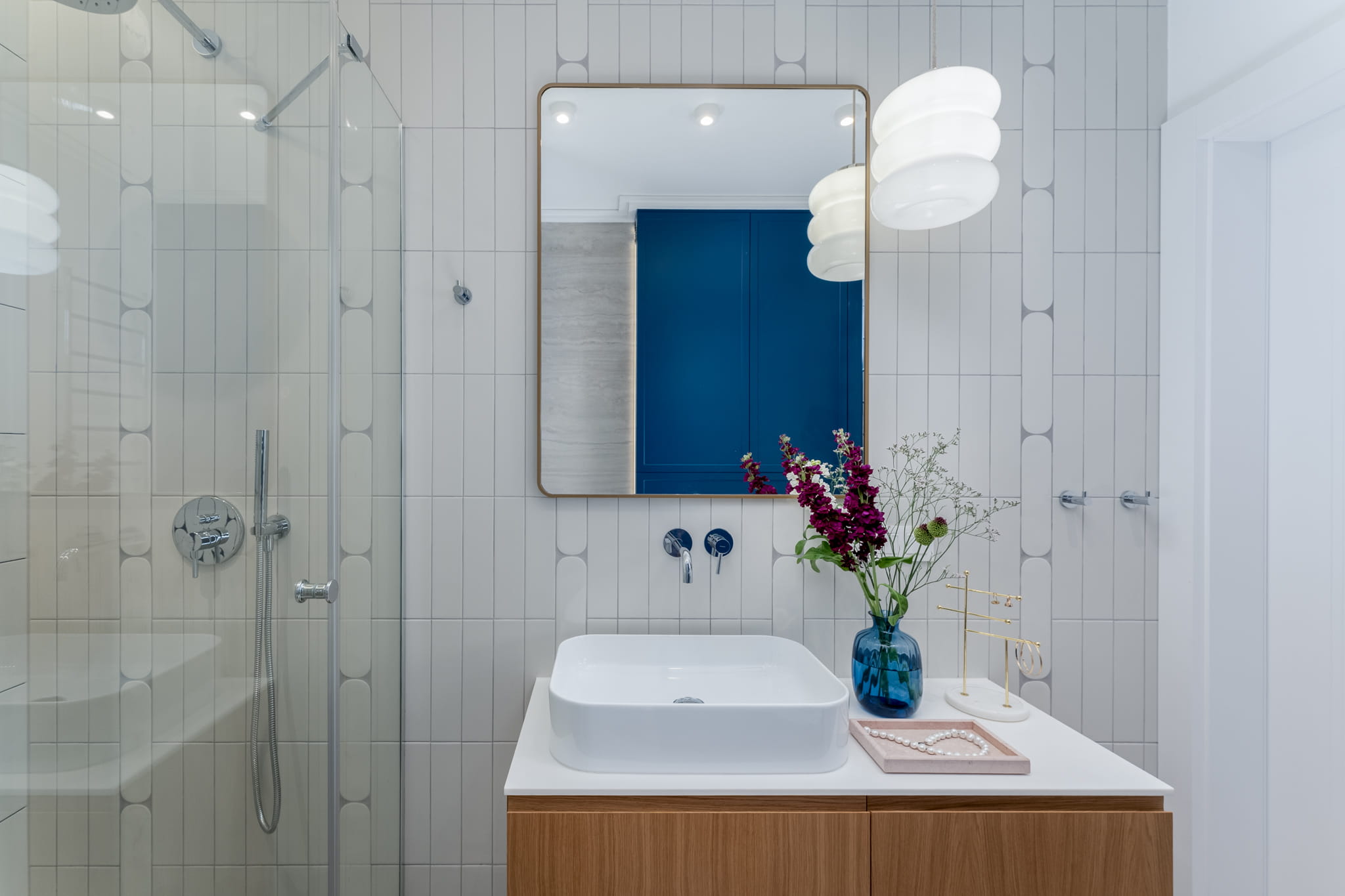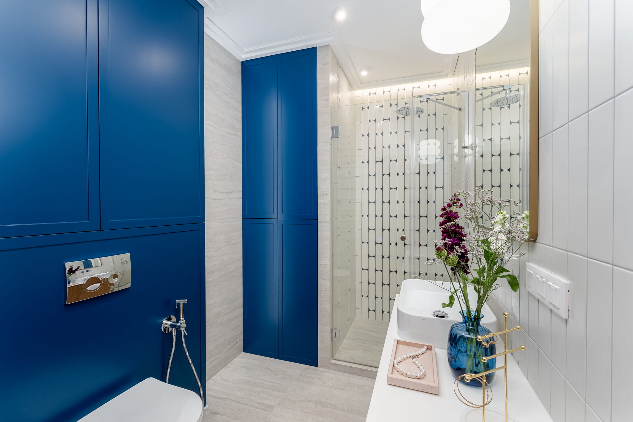 Szczególną uwagę zwraca łazienka z intensywnie niebieską zabudową meblową, zaprojektowaną jako mocny akcent wnętrza. Strefę prysznica wykończono drobną mozaiką z ciemnoniebieską fugą, co nadało przestrzeni wyrazisty, ale nadal elegancki charakter.