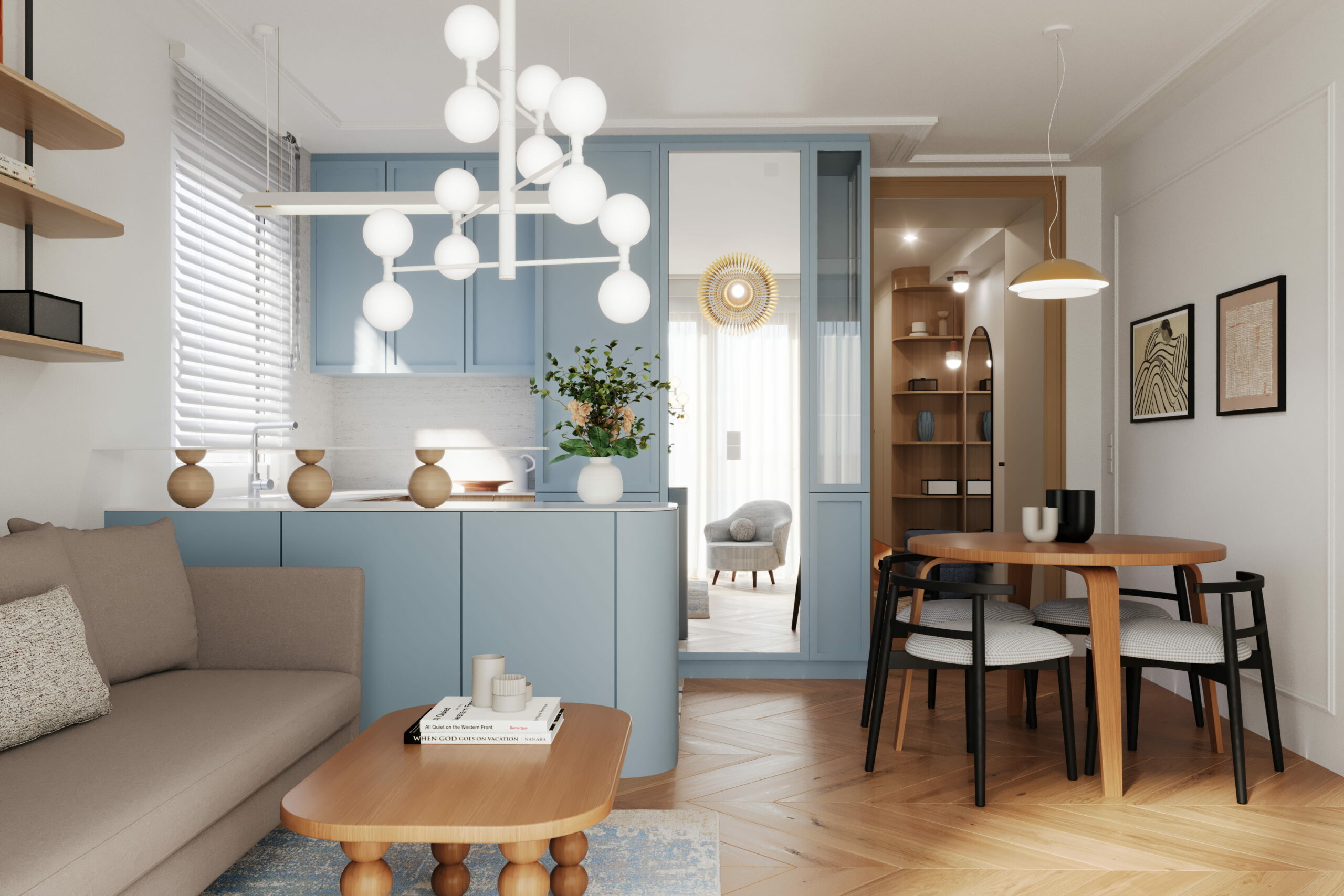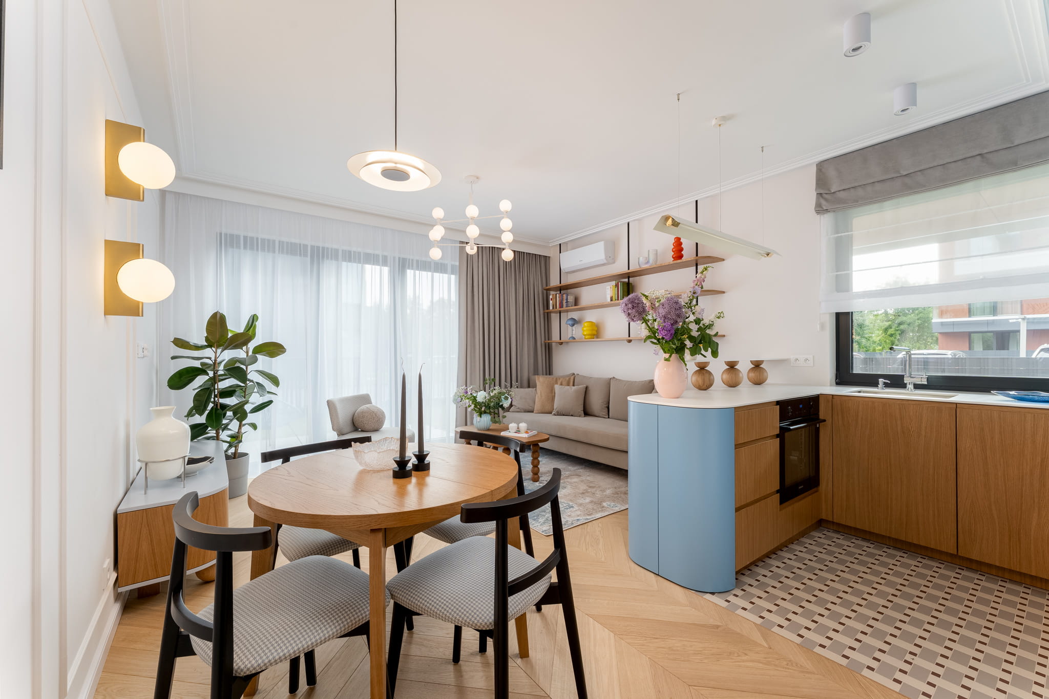 Motywem przewodnim aranżacji jest jasny, szlachetny odcień niebieskiego, który pojawia się w lakierowanych zabudowach meblowych wykonanych na wymiar przez stolarza.