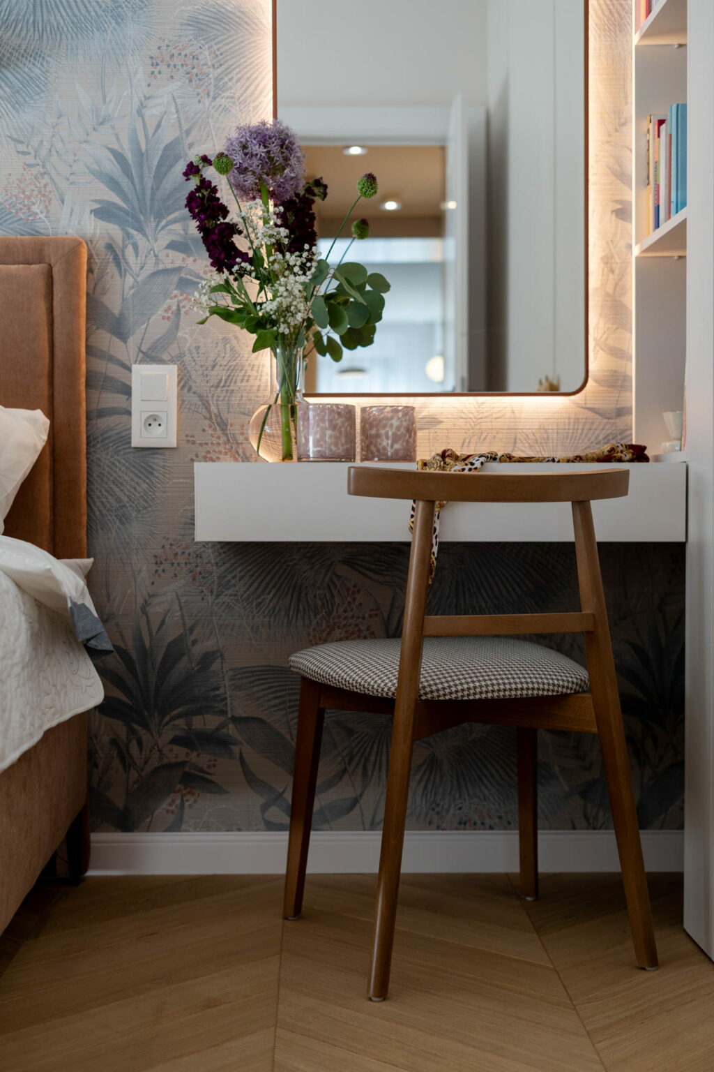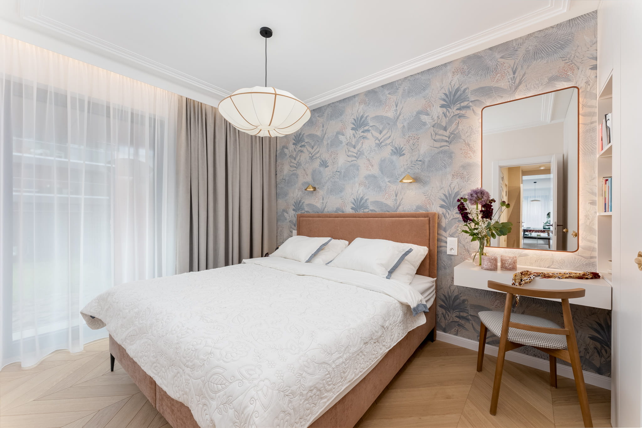 We wnętrzach zastosowano sztukaterię sufitową i ścienną oraz tapety dekoracyjne, w tym botaniczny motyw w sypialni, który podkreśla spokojny, domowy charakter mieszkania.