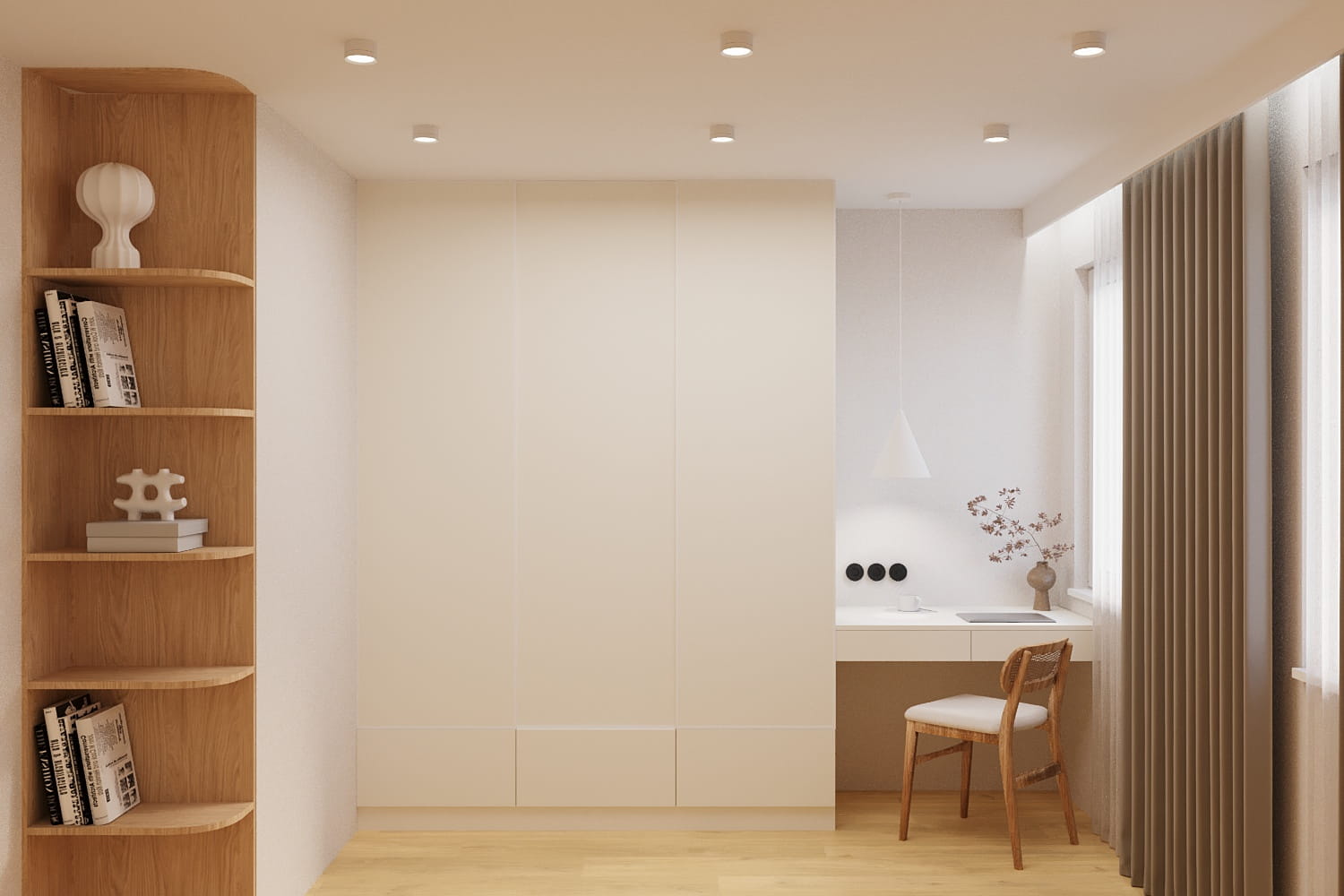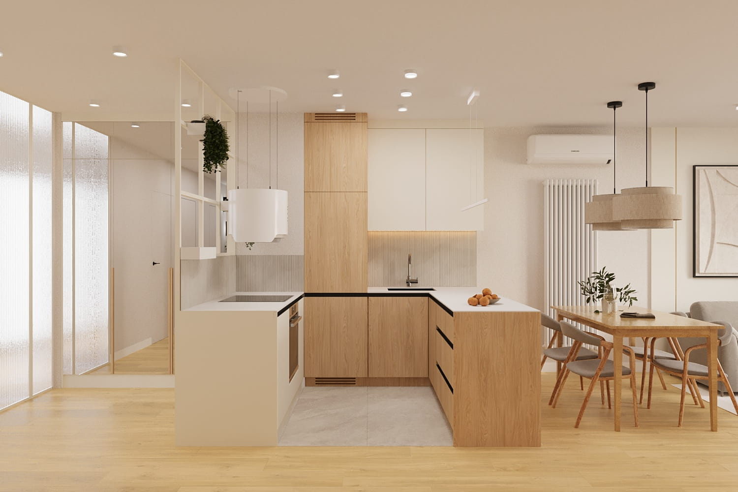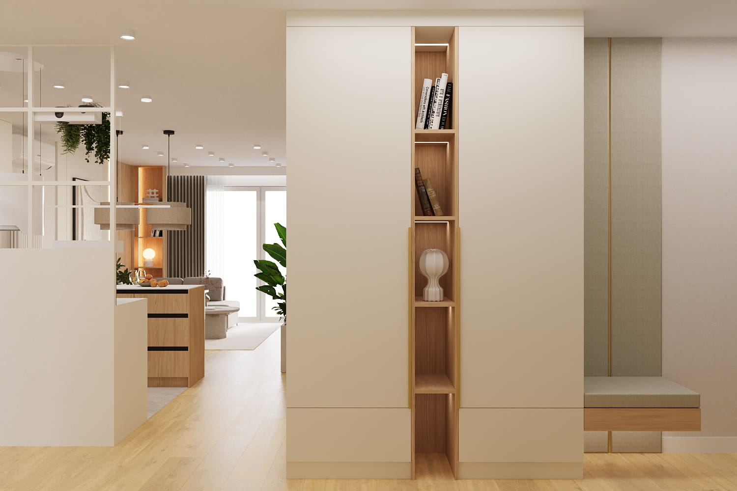 Wnętrze utrzymane jest w jasnej kolorystyce inspirowanej stylem Japandi, z dominacją bieli, szarości i naturalnego drewna. Mieszkanie jest doskonale doświetlone, a oświetlenie warstwowe pozwala na tworzenie funkcjonalnych i nastrojowych stref.