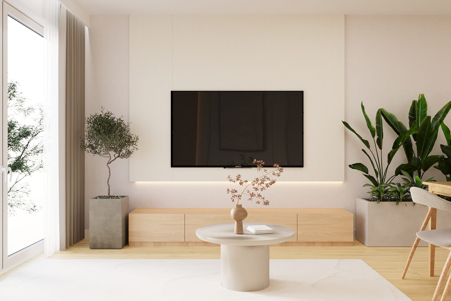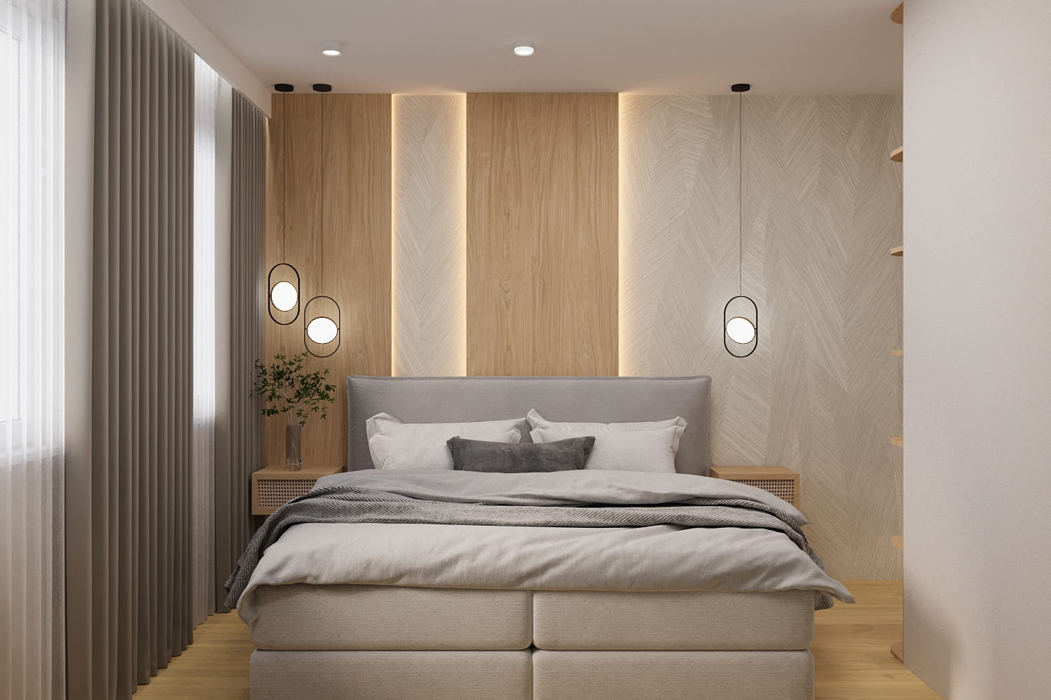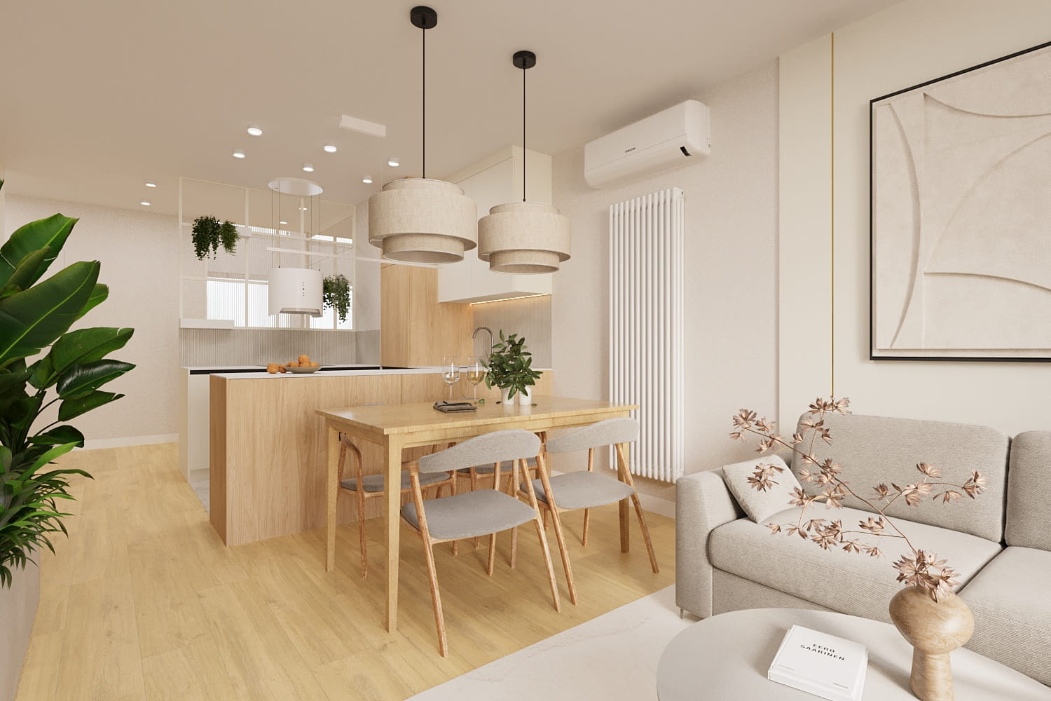 Wnętrze utrzymane jest w jasnej kolorystyce inspirowanej stylem Japandi, z dominacją bieli, szarości i naturalnego drewna. Mieszkanie jest doskonale doświetlone, a oświetlenie warstwowe pozwala na tworzenie funkcjonalnych i nastrojowych stref.