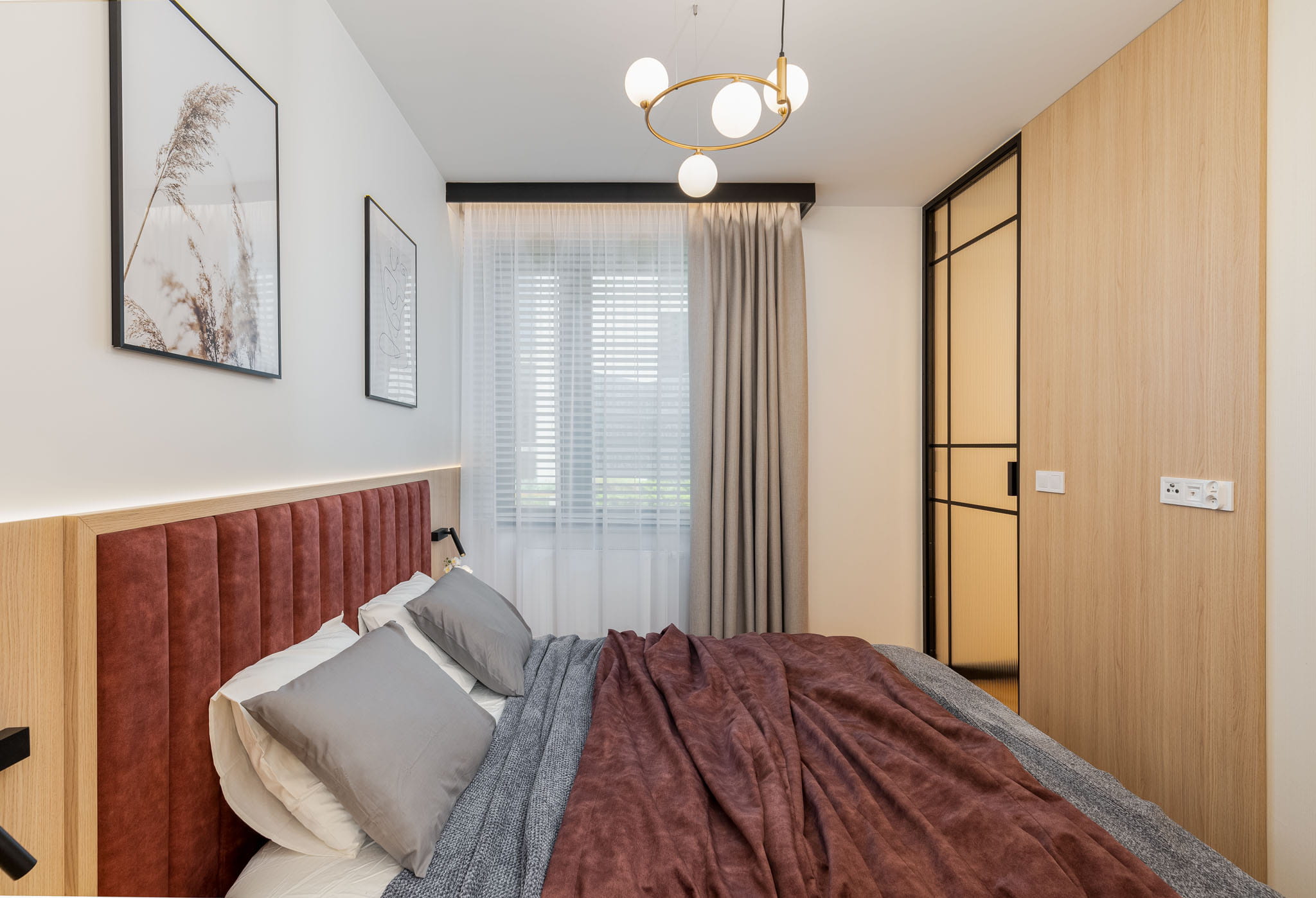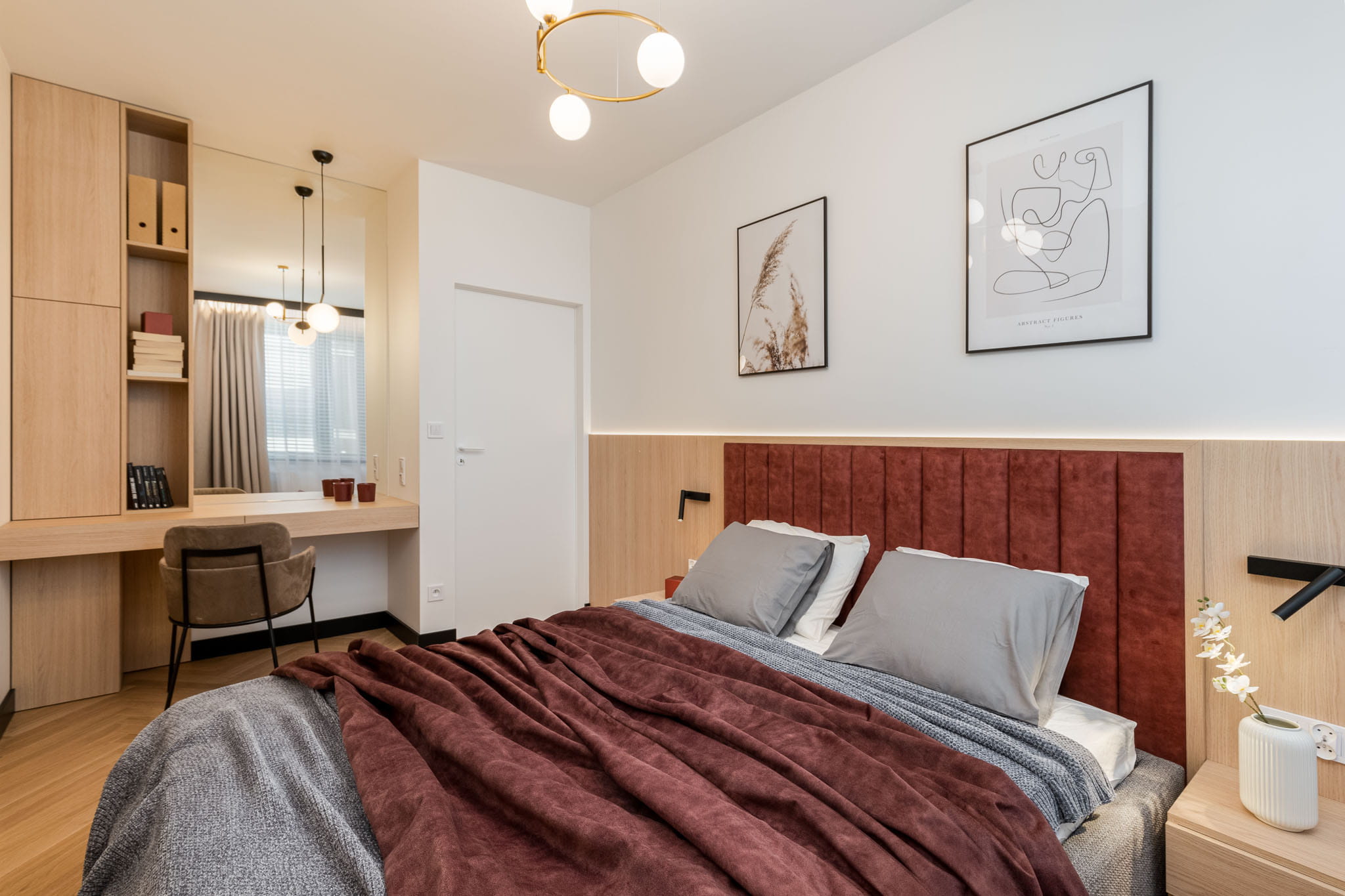 W sypialni zaprojektowaliśmy zarówno wydzieloną garderobę za szklanymi drzwiami w czarnej, aluminiowej ramie, jak i funkcjonalne miejsce do pracy, odpowiadające współczesnym potrzebom klientów. Komfort wnętrza podkreślają miękkie tapicerki – zagłówek łóżka oraz siedziska wykonane na zamówienie przez tapicera.