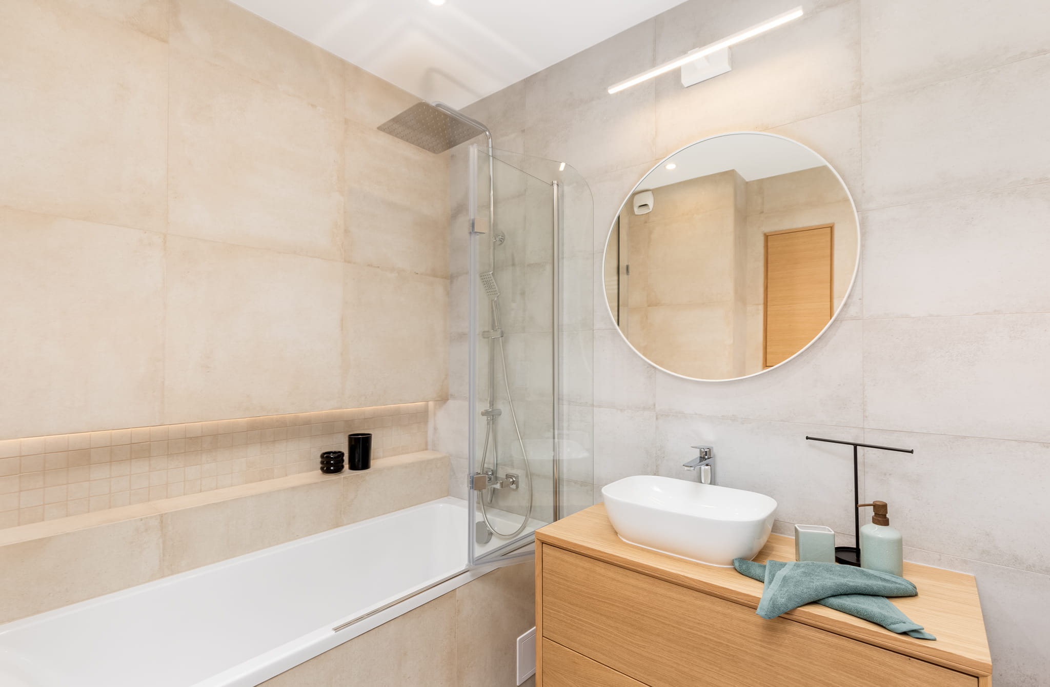 W przestronnej łazience znajduje się szafka umywalkowa, pralką i suszarką, szafka ścienna. Wanna z parawanem.