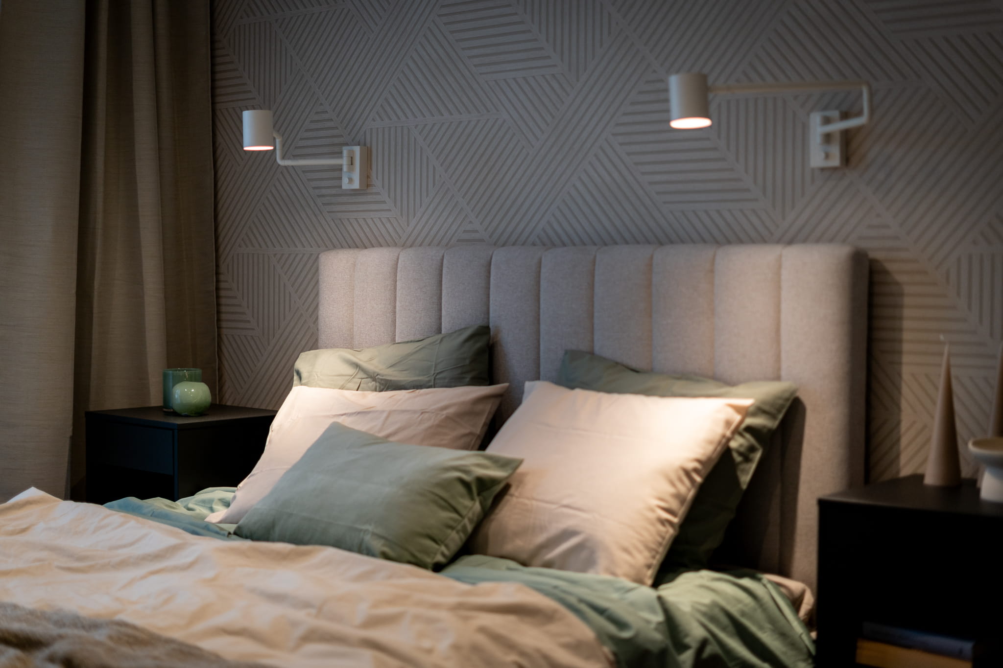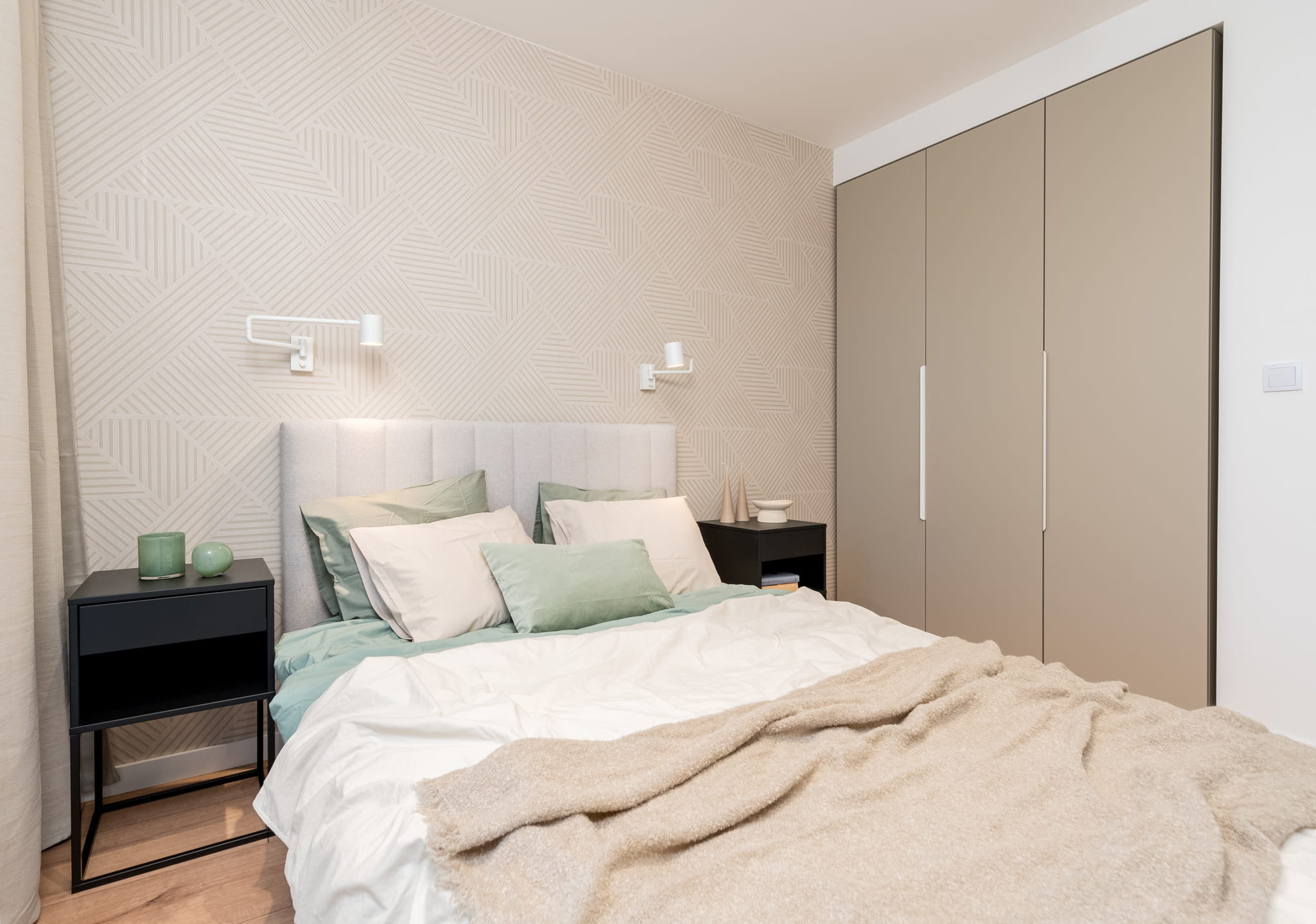 W pierwszej sypialni znajduje się łóżko (160×200) oraz szafa i szafki nocne. Na ścianie za łóżkiem tapeta.