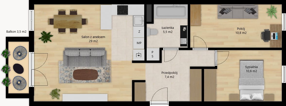 Mieszkanie składa się z salonu z aneksem kuchennym (29 m²), sypialni (10,6 m²) oraz pokoju (10,8 m2), łazienki z wanną (5,5 m²) i balkonu (4 m2). Mieszkanie położone na 1 piętrze. W przedpokoju ( 7,4 m2) pojemna szafa. Przestrzenny taras o powierzchni 14,5 m2.
